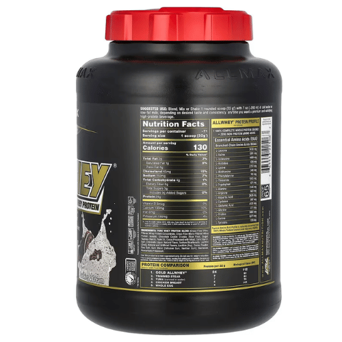 GOLD ALLWHEY® no solo te proporciona toda la proteína que necesitas, sino que cada cucharada contiene solo 4 g de carbohidratos y 130 calorías por porción. ¡Eso significa un 70 % menos de carbohidratos y azúcares que las proteínas de suero de leche en polvo regulares! Obtén todas las ganancias de masa muscular magra sin carbohidratos añadidos. GOLD ALLWHEY®: proteína de suero de leche pura, premium y sin desnaturalizar.