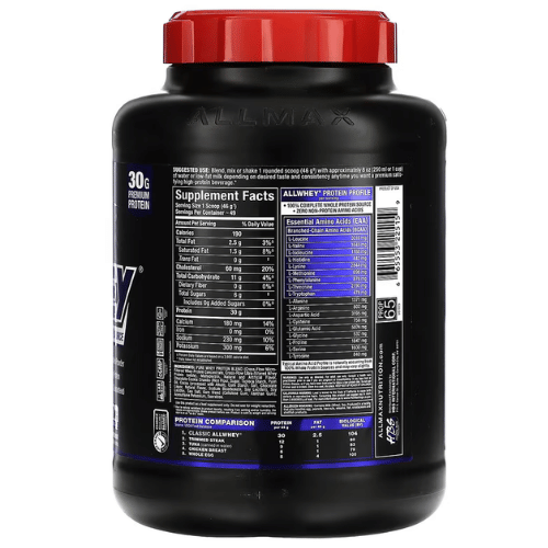 - Fuente de proteína de suero 100 %: Classic AllWhey no tiene fuentes de proteínas inferiores sin suero como soja o carne de vacuno. No tiene aminoácidos sin proteínas y sin rellenos. ¡Cada gramo de proteína reclamada es una verdadera proteína! AllWhey ofrece un concentrado de proteína de suero de leche premium para ayudar a reconstruir tus músculos después de un entrenamiento intenso. La investigación muestra que los niveles de proteínas más altos después del entrenamiento ayudan a que los músculos se recuperen más rápido.