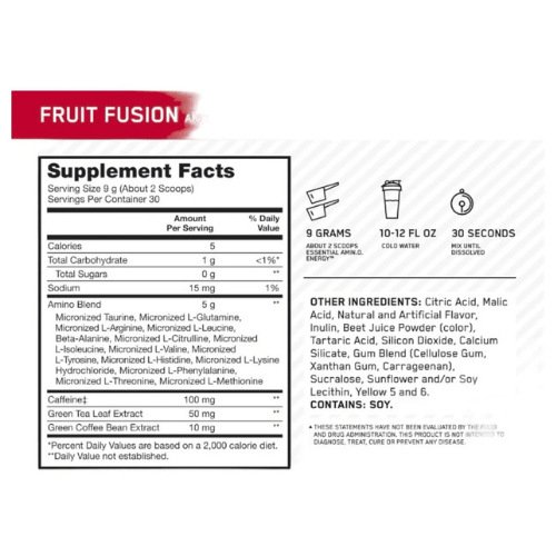 Mezcle dos scoops de ESSENTIAL AMINO ENERGY en 10-12 oz de agua fría. PARA UN AUMENTO DE AMINOÁCIDOS: Consuma una o más porciones a primera hora de la mañana y / o entre comidas. PARA ENERGÍA PREVIA AL ENTRENAMIENTO: Tome 1-3 porciones 20-30 minutos antes del entrenamiento