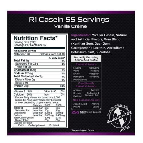 - Proteína de liberación lenta: la caseína R1 proporciona 0.88 oz por porción en un batido espeso y satisfactorio. Utilizamos proteína de caseína micelar, por lo que sigue funcionando mucho después de haber salido del gimnasio. El 100% de la proteína en esta fórmula proviene de caseína micelar.