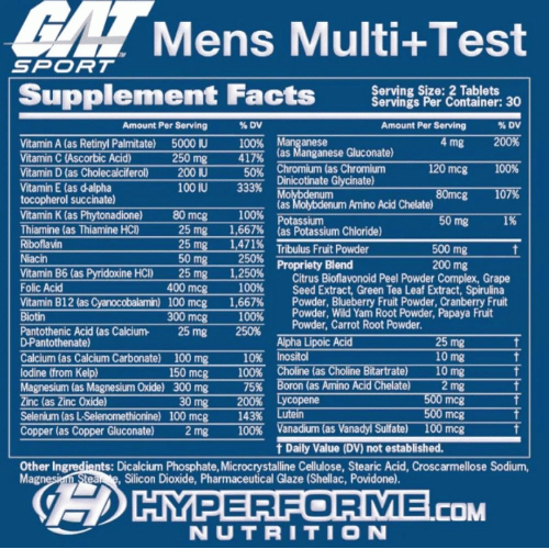 Men’s Multi+Test es un multivitamínico diseñado para atletas que combina vitaminas, minerales y el extracto de Tribulus Terrestris para apoyar la energía y los niveles de testosterona. Multivitamínico con soporte de testosterona