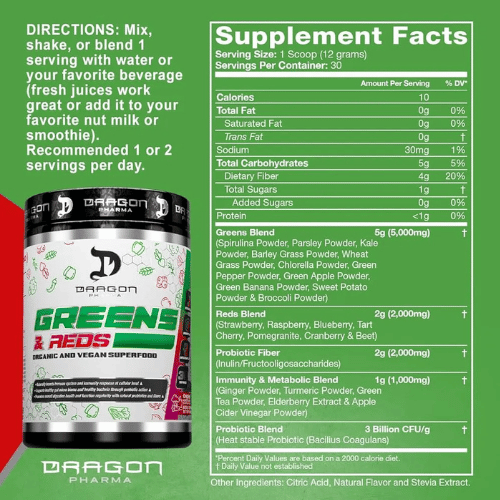 • Dragon Pharma Greens & Reds es la combinación perfecta de frutas y verduras rojas de la más alta calidad en la Tierra.