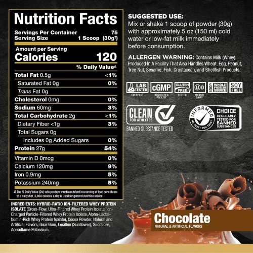 Así es, Pure Whey Protein Isolate al alcance de su mano, ¡lo que le brinda un increíble contenido de proteína del 90 %! Solo con fracciones de proteína de suero nativas e intactas, no desnaturalizadas. 27 g de Proteína Pura que ha sido probada, certificada y aprobada en laboratorio.