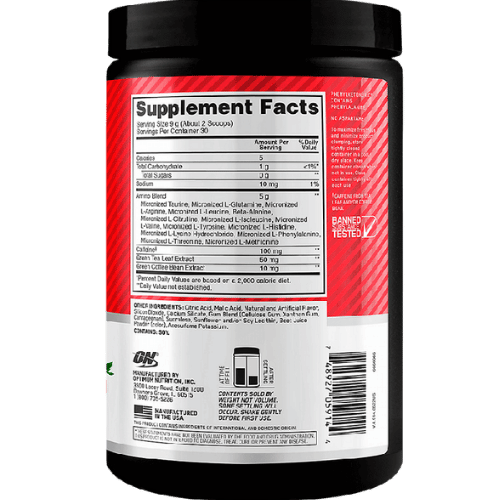 - 100 miligramos de cafeína de fuentes naturales; 0.18 onzas de aminoácidos; solo 5 calorías por porción y cero azúcar