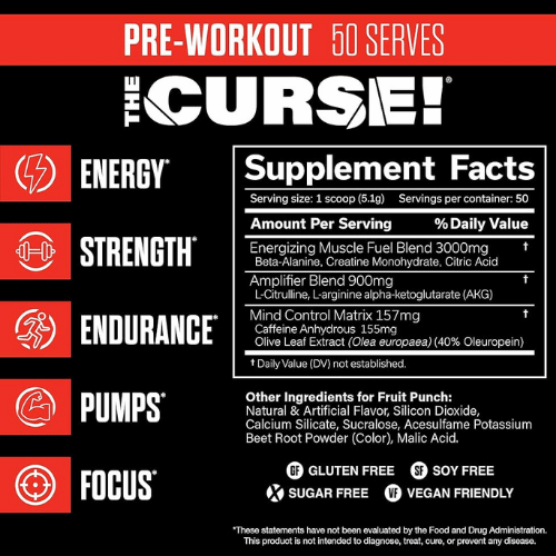 • Ingredientes poderosos: ¡The Curse! contiene una poderosa mezcla de ingredientes diseñados para amplificar la fuerza y ​​el rendimiento, maximizar el bombeo y ayudarte a superar los estancamientos: formulado con creatina, L-citrulina, L-arginina, cafeína y beta-alanina para obtener resultados que puedes sentir.